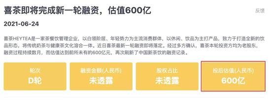 就在奈雪上市前6天,喜茶完成最新一轮融资,并未透露融资规模。不过,此次融资后,喜茶估值由去年的约160亿元翻三倍至600亿元,几乎是奈雪市值的两倍。