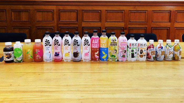 在记者采购的25种饮料中,与桃子味有关的共5款(不包括农夫山泉的拂晓白桃,报社周边的便利店未销售该款产品),分别是元气森林白桃味苏打气泡水、酷氏白桃味苏打气泡水、AH!HA!小宇宙白桃乌龙茶味气泡水、盒马桃桃乌龙茶、喜茶地中海桃桃金凤果汁茶饮料。