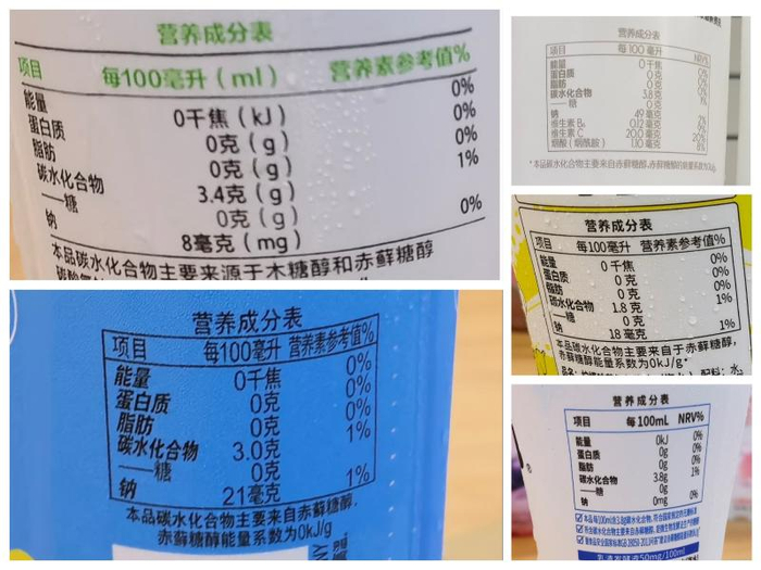 例如,部分饮料添加了木糖醇、山梨醇等代糖,它们都是营养性甜味剂,会产生热量,只是比蔗糖低。这些热量构成了一部分碳水化合物,而代糖的含量又低到符合国家标准标注“0糖”的要求,从而出现了产品营养成分表中“碳水化合物不为0,但糖为0”的现象。