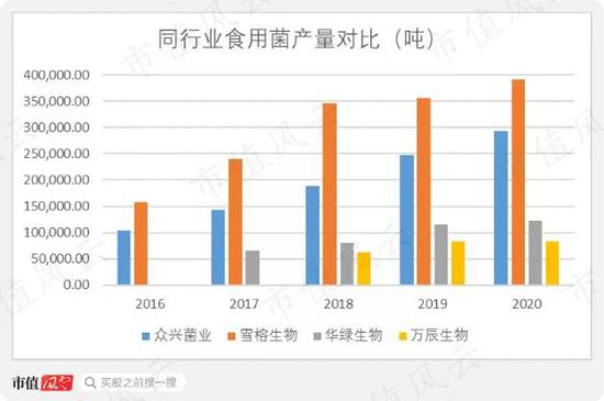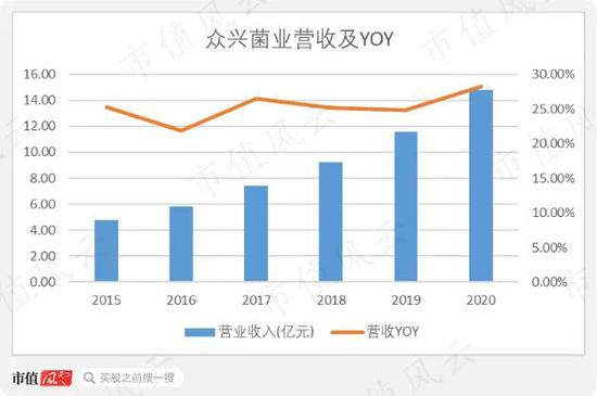 众兴菌业于2015年在中小板上市,主营菌菇种植,主要产品包括金针菇、双孢菇等。目前在行业排行老二,次于雪榕生物。