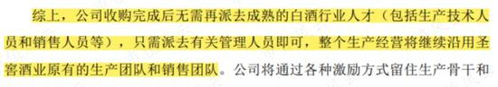 上市公司对此回复,白酒业务沿用圣窖酒业原有团队,公司只派去管理人员即可,目前公司暂无减持计划。