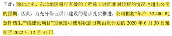 发行可转债对应的三个项目,其中两项收益不及预期,另一项“年产32,400吨金针菇生产线建设项目”位于吉林,原本完工时间为2020年6月30日,现延期至2022年12月31日。
