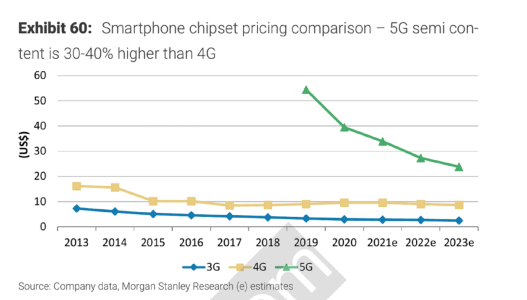 据报告预测,目前5G建设的进程已过半。2021年全球5G的产业进程将达到40%左右。未来两三年内,5G智能手机将完成对4G手机的替代。而5G智能手机里的芯片在数量上比4G手机多30%到40%左右。