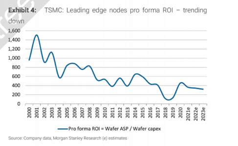 报告却提出了与之相反的观点。报告强调,目前,半导体行业的利润在下降,台积电对新设备的投入成本仍在增加。报告认为,尽管短期内台积电的利润还在不断增加,但是其毛利润和投资回报呈不断下降的趋势。