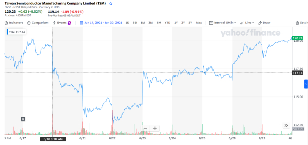 台积电股价自18日起一路下跌,21日更是低开低走,单日市值蒸发近5000亿新台币(大约1000亿人民币),22日触6月股价最低点112.62美元,与同期国内芯片市场的火爆形成鲜明对比。