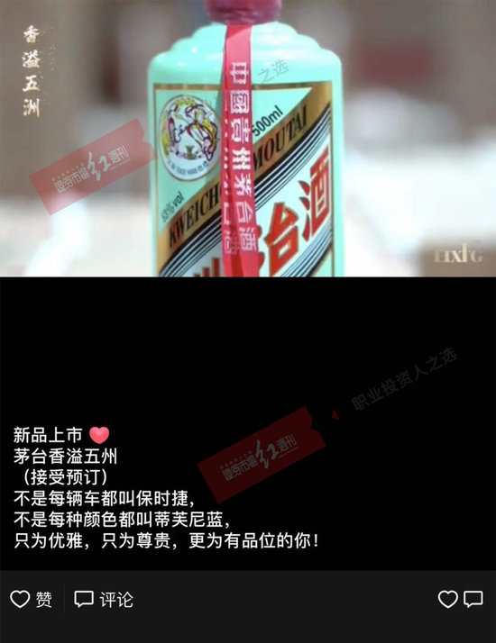 一位茅台经销商于6月28日在其朋友圈表示新品上市,茅台“香溢五洲”接受预定。与此同时,还搭配“不是每辆车都叫保时捷,不是每种颜色都叫蒂芙尼蓝,只为优雅,只为尊贵,更有品味的你!”的广告语进行宣传,颇有将“香溢五洲”和奢饰品划等号的意思。