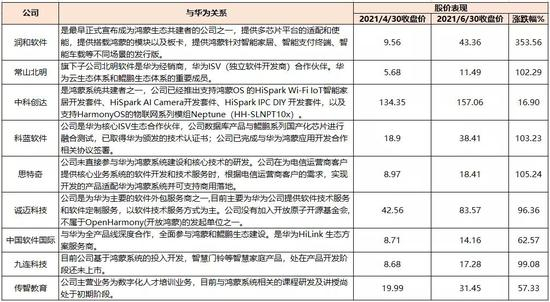 以下为主要鸿蒙概念股与鸿蒙生态的关系,以及近两个月的股价表现。