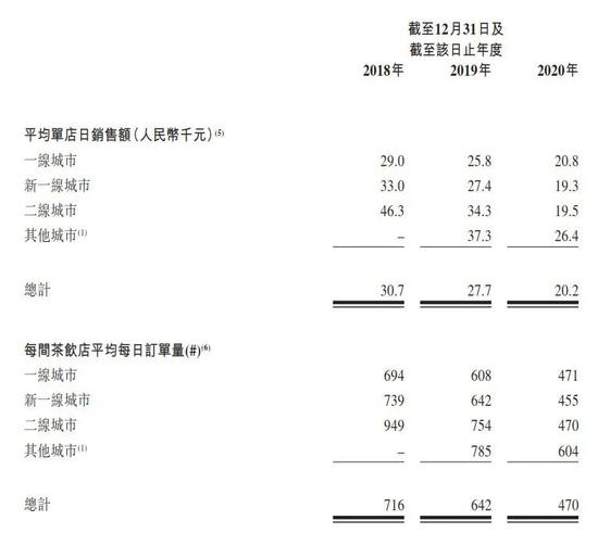 数据显示,2018年-2020年,奈雪的茶平均单店日销售额从3.07万元降至2.02万元;平均日订单量从716单降至470单;门店经营利润率从18.9%降至12.2%。