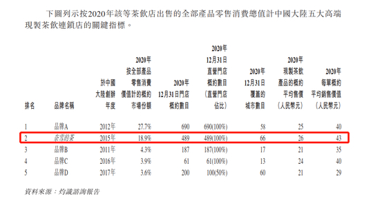 截至2020年末,中国约有34.8万家现制茶饮店,现制茶饮的平均售价约为13元,其中,高端品牌店约3400间,前五大高端玩家,约占58%的高端市场份额,奈雪的茶排名第二,市场份额为18.9%,高端市场的老大是喜茶,市占率约27.7%。