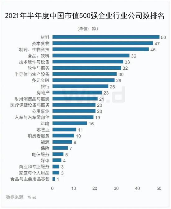 从分行业数量排名看,材料行业入围公司数量最多,共50家;其次为资本货物,共47家;制药与生物科技排名第三,共45家。