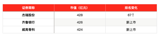 《大舜财经》注意到,57家新面孔当中,有三家来自于山东的本土企业上榜,他们分别是杰瑞股份、齐鲁银行和威高骨科,三家企业的市值分别是428亿元、426亿元和424亿元,其中齐鲁银行与威高骨科均为新上市企业。