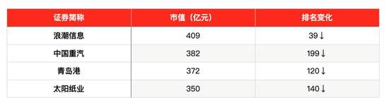 浪潮信息的市值是409亿元,下降39名;中国重汽市值382元,下降199名;青岛港市值372亿元,下降120名;太阳纸业市值350亿元,下降140名。