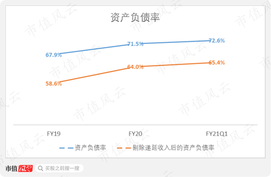公司的资产负债率相对较高,在2021年一季度末升至72.6%,剔除递延收入之后的资产负债率也达到65.4%。