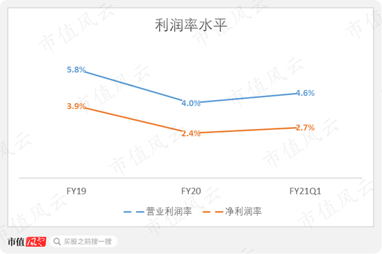 营业利润率和净利润率均在2020年出现下滑后,在2021年一季度出现回升,分别增长至4.6%和2.7%。但还远没有恢复至2019年的水平。