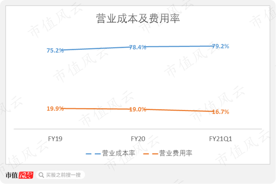 较高的成本和费用率,是导致亚朵利润率远低于同行业可比公司的主要原因:营业成本率一路上升至2021年一季度的79.2%,营业费用率则不断改善至16.7%。