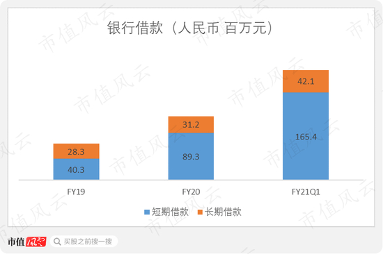 近年来,公司的银行借款规模持续增长,其中短期借款迅速增长至2021年一季度末的1.65亿元,长期借款增长至4200万元。