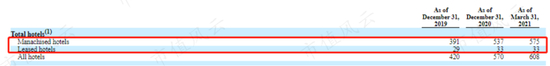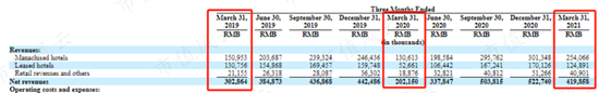 自营酒店贡献的营收占比则不断下滑,从2019年的39.2%下滑至2020年的31.7%,再到2021年一季度的29.7%。
