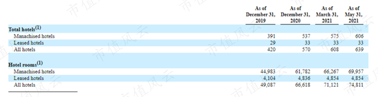 截止2021年5月31日,公司旗下拥有管理加盟酒店606间,自营酒店33间,总计639间。
