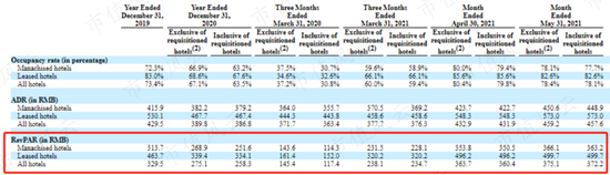 2021年5月,酒店整体RevPAR为375.1元,其中加盟酒店和自营酒店的RevPAR分别为366.1元和499.7元,均高于2019年的313.7元和463.7元。