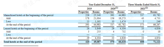截止2021年3月31日末,公司旗下客房总数为71121间,其中加盟酒店客房数为66267间,自营酒店客房数为4854间。