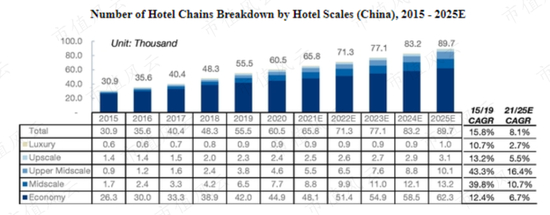 在连锁酒店转移重心以及中国持续消费升级的推动下,中档及中高档细分市场在所有类别中增长最快,2015 年至 2019 年的复合年增长率分别为 35.1% 和 25.7%。