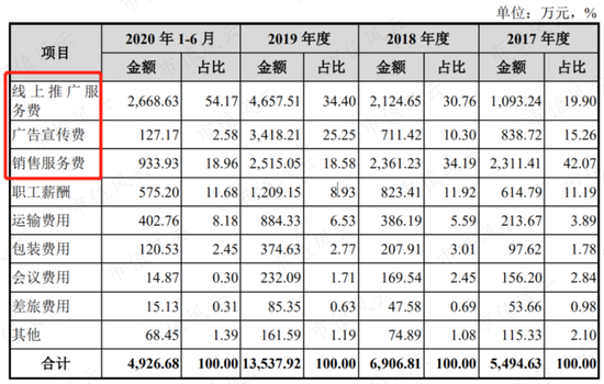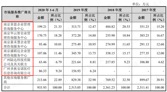 2017-2020年上半年,销售服务费金额分别为2311、2361、2515和933万,其中支付给比照关联交易的市场推广商的销售服务费占比一直在60%以上。