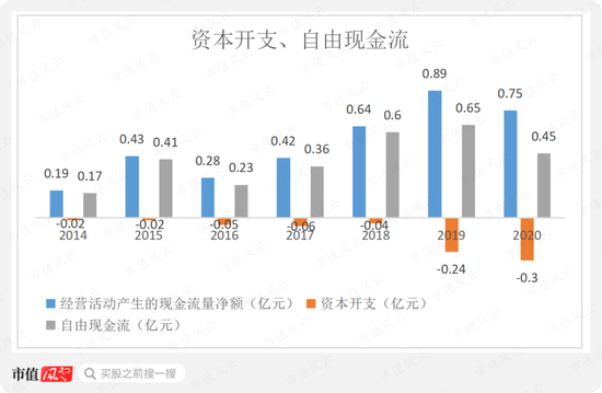 2014-2020年,公司资本开支金额均较小,从而自由现金流金额较大,累计产生自由现金流2.87亿,现金分红金额是自由现金流的60%,分红力度大是公司为数不多的优点之一。