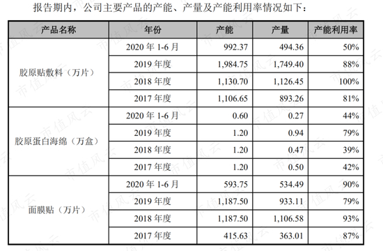 面膜贴2018-20年产能均为1186万片,产能利用率均处于较高的水平。
