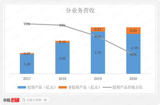 非胶原产品虽增长较快,但规模仍较小,2020年营收也仅为0.43亿。