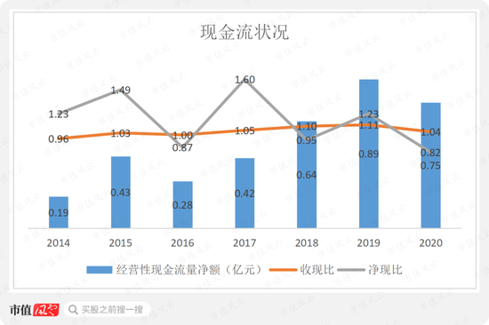 2014-20年,公司现金流状况明显改善,经营性现金流量净额由0.19亿增长至0.75亿。净现比有所波动,但维持在0.8以上。收现比维持在1左右,主要是由于公司采用的先款后货政策。
