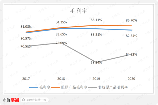 2017-20年,公司的毛利率维持在80%-84%之间,维持在较高水平,与占营收比例较大的胶原产品毛利率趋同。