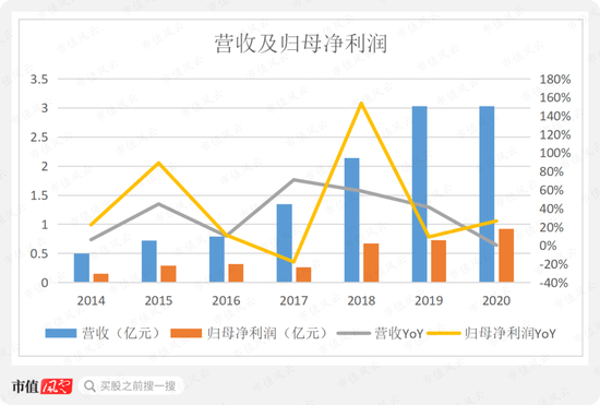 2014-20年,公司的营收和归母净利润分别从0.5亿和0.15亿增长至3.03和0.92亿,CAGR均为35%,增长较快。