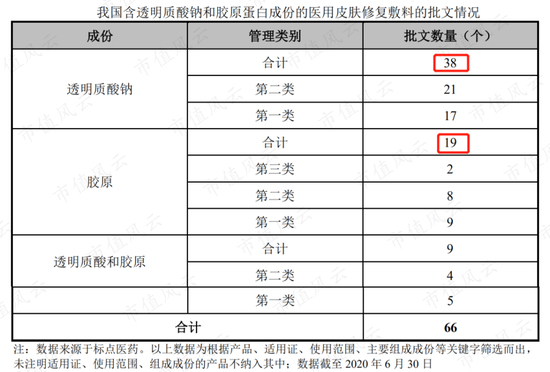 截至2020年6月30日,我国含透明质酸钠的医用敷料产品数量为38个,多于含胶原蛋白的敷料19个,但透明质酸钠敷料没有Ⅲ类批文。