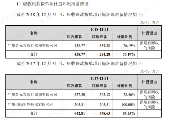 2017年和2018年,公司对关联方金元吉的单项计提坏账准备分别343万和334万,计提比例分别为78%和76%。