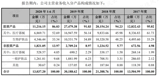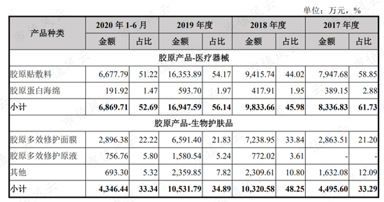 公司的胶原产品包括医疗器械和生物护肤品,2020年年报公司没有披露细分产品占比,以2019年为例,胶原产品中的医疗器械和生物护肤品营收占比分别为56%和35%。