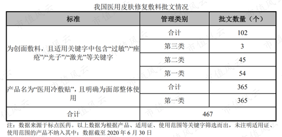 根据公司招股书,截止2020年6月30日,我国医用皮肤修复敷料批文合计有467个,其中仅有3个按照Ⅲ类管理的医用皮肤修复敷料医疗器械产品。