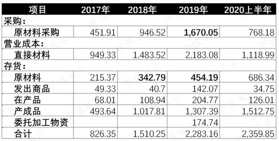 经过风云君的测算,2018年、2019年和2020年上半年,各期原材料消耗金额分别为819.1万、1558.65万和536.03万,比各期实现销售结转的营业成本—直接材料金额分别少了664.42万、624.43万和582.96万。