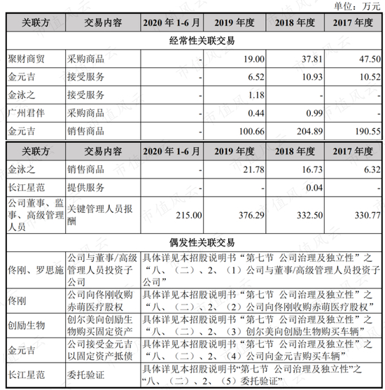 除此之外,公司还存在一定比例的销售商品等关联交易和比照关联交易事项,涉及经常性关联交易和非经常性关联交易。其中2017-19年对关联方经销商金元吉的销售金额较大,均超过百万。