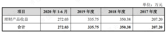 对比公司2020年底总资产3.13亿,2017-2020年上半年公司购买的理财产品余额均超过1亿元,金额不菲,各期为公司贡献的投资收益均超过200万。