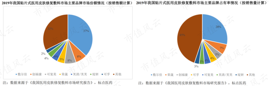 2019年,创福康和可复美的占有率分别为5%和4%,分别位列第3和第5,但由于可复美的单价较贵,最终两者市场份额相同,均为8%,分别位列第二和第三,两家的竞争差距并不大。