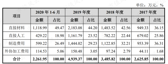 2017-2020年上半年公司的主营业务成本占营业成本的比例均在98%以上。主营业务成本主要由直接材料、直接人工、制造费用构成,外协加工费用占比较小。