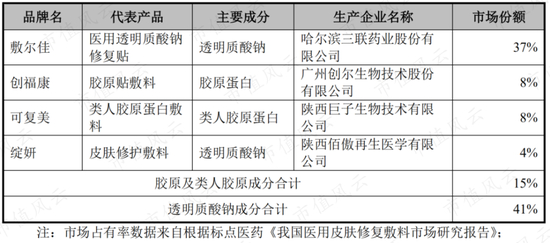 根据标点医药数据,2019年我国贴片式医用皮肤修复敷料市场主要品牌中,主要成分为胶原及类人胶原的产品所在品牌市场占有率合计15%,主要成分为透明质酸钠的产品所在品牌市场占有率合计41%。