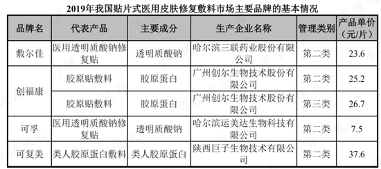 其中国内企业2家,分别为创尔生物和浙江崇山生物制品有限公司,产品均为“胶原贴敷料”;进口企业一家,为瑞典墨尼克医疗用品有限公司,产品属于非胶原类修复敷料。