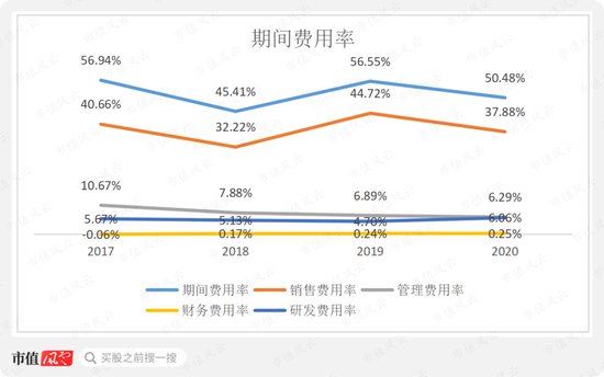 2017-20年,公司的期间费用率在45%-57%之间波动。