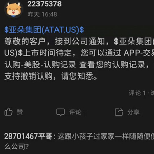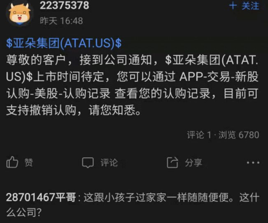 通知显示,“尊敬的客户,接到公司通知,亚朵集团(ATAT)上市时间待定,您可以通过APP-交易-新股认购-美股-认购记录,查看您的认购记录,目前可支持撤销认购,请您知悉。“