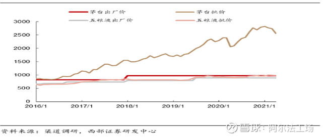 从终端价格上来看,茅台3000元左右,五粮液1100-1200元区间,巨大的价格差已经说明茅台行业地位和品牌强度,茅台巨大的指导终端差,以及产品的供不应求,形成了高端需求外溢,这对于行业其他高端产品也形成机会,如五粮液、国窖、青花郎等。