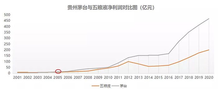 而茅台对五粮液的赶超首先体现在营收和净利润上。净利润是衡量企业盈利能力尤其是同一行业纵向对比的重要指标。2005年之前,五粮液净利润规模一直在茅台之上,但在2005年却被茅台超越,此后再也无法赶超;当年五粮液净利润7.91亿元,茅台净利润11.19亿。