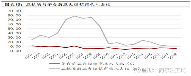 五粮液真正意识到大商制弊病是在08年前后,2005-2008年间五粮液前五大经销商营收占比超70%,而同期茅台占比一直在10%附近。直到2009年开始,大商制问题才开始有所有改观,到10年降至20%以下。