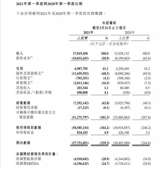 最后看快手2021年一季度的数据:快手总收入达人民币170亿元,同比增长36.6%,但相比2020年四季度的181亿减少了一些。一季度净亏损577.5亿元,调整后净亏损为49.2亿元,对比以往数据,2020年快手全年净亏损为79.49亿元,今年一季度亏损额就占到去年全年的62%。亏损扩大的同时,毛利率也跟着下降,一季度快手毛利环比下降17.8%至69.88亿元。