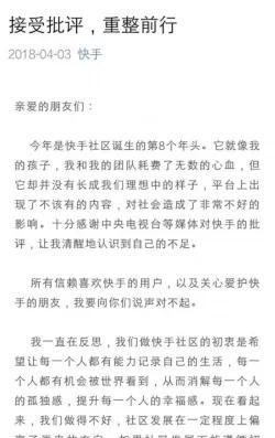 此后宿华在微信公众号中发表了道歉文章《接受批评,重整前行》。宿华谈到:今天,快手爆发出来的问题,是长久以来我们一直没能重视的问题,我们不会推诿责任和逃避监管。快手渴望跟所有的用户一起,与这个国家、这个时代共成长。我们将重整社区运行规则,将正确的价值观贯穿到算法推荐的所有逻辑之中,坚决抵制和删除违法违规及色情低俗视频,建立专门的青少年保护体系,打造一个风清气朗、健康向上的负责任的互联网社区。